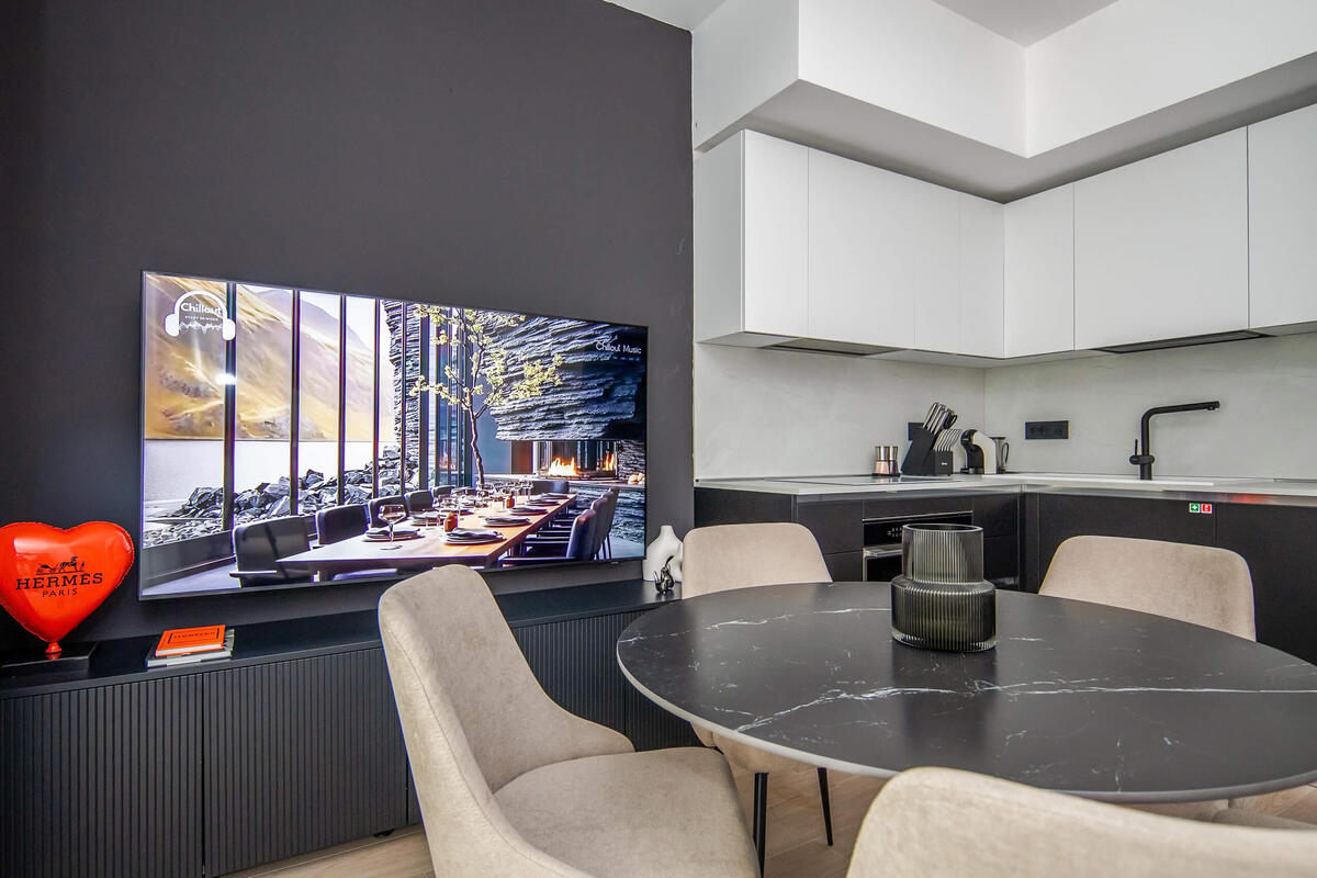 Indulge in the elegance of a custom-designed CREO kitchen, perfect for culinary creations. Unwind in the spacious living area, featuring large-screen Smart TVs, fast Wi-Fi, and stylish comfort throughout, making every moment feel relaxed and luxurious.